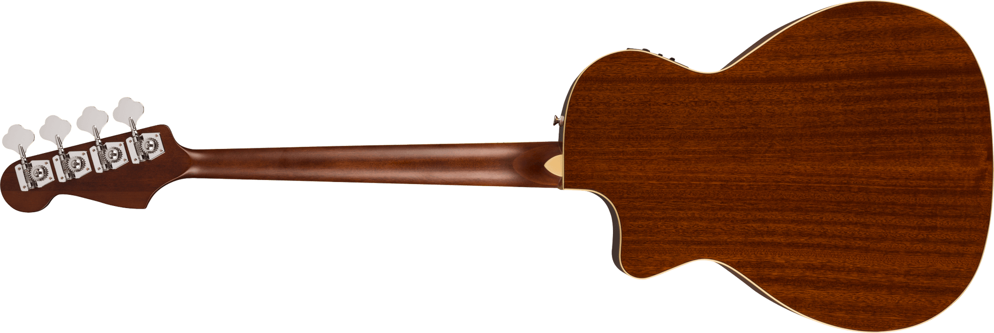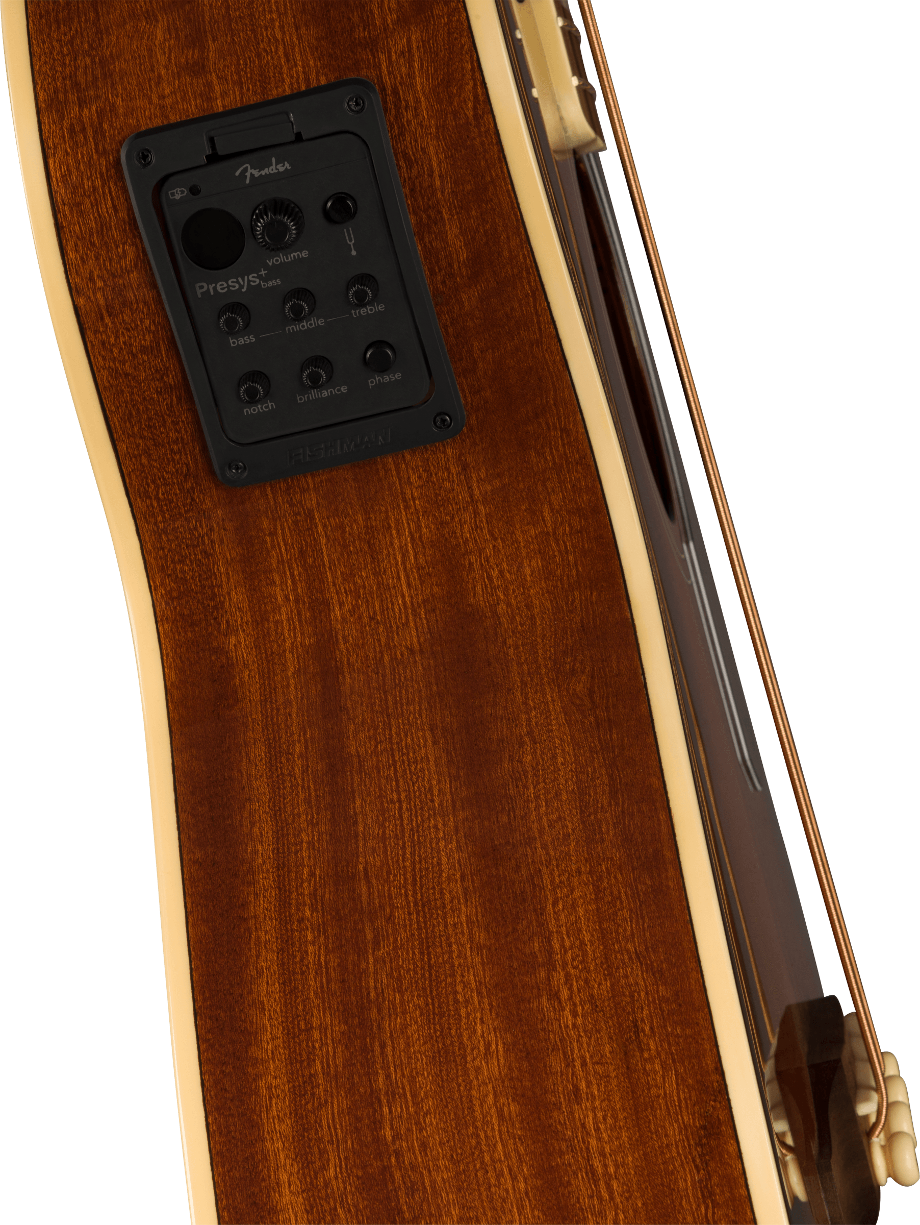 Crafted with an X-braced solid spruce top and sapele back and sides, the compact mid-sized auditorium body of the Kingman™ Bass produces a deep, punchy, and articulate tone and features a cutaway for convenient access to the upper frets. The bound nato neck is elegantly appointed with block inlays and is designed with a slim "C"-shaped Jazz Bass® profile, an easy-to-play short 30" scale length, comfortable 1.5" nut width, and a 4-in-line headstock for a distinctive look born from Fender's electric bass DNA. Other notable details include open-gear vintage-style tuning machines for smooth, accurate tuning, a GraphTech® NuBone® nut and saddle for focused fundamental tone, and a Fishman® Presys preamp system that allows detailed fine-tuning of the bass's amplified sound when performing or recording. A deluxe gig bag is included.