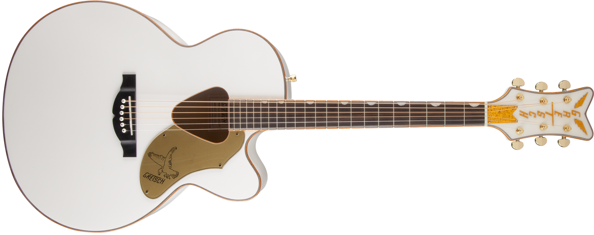 Its jumbo cutaway body includes dazzling gold-sparkle binding on the top, back, sound hole, fingerboard and headstock. Other premium features include a solid spruce top with scalloped "X"-bracing and classic Rancher triangular sound hole, maple sides and arched back, mahogany neck, 21-fret laurel fingerboard with Neo-Classic™ "thumbnail" inlays, "V"-shaped headstock with vertical winged "Gretsch" sparkle logo, compensated bridge with laurel base, deluxe tuners, and gold-plated hardware. The Fishman® Sonicore under-saddle pickup and Isys preamp system provide great amplified performance and flexible sonic control, with volume, tone and phase controls, onboard tuner and battery life indicator.
