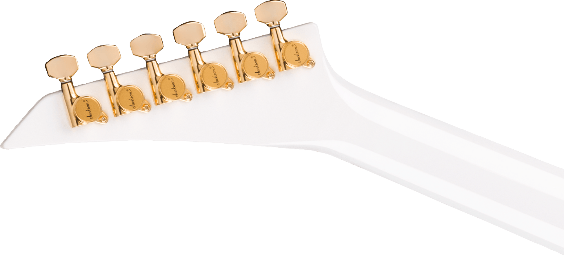 - Available in Gloss Black with yellow pinstripes or Snow White with black pinstripes, and with color matched Jackson pointed 6-in-line headstock and gold hardware