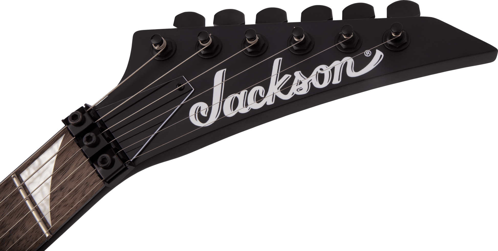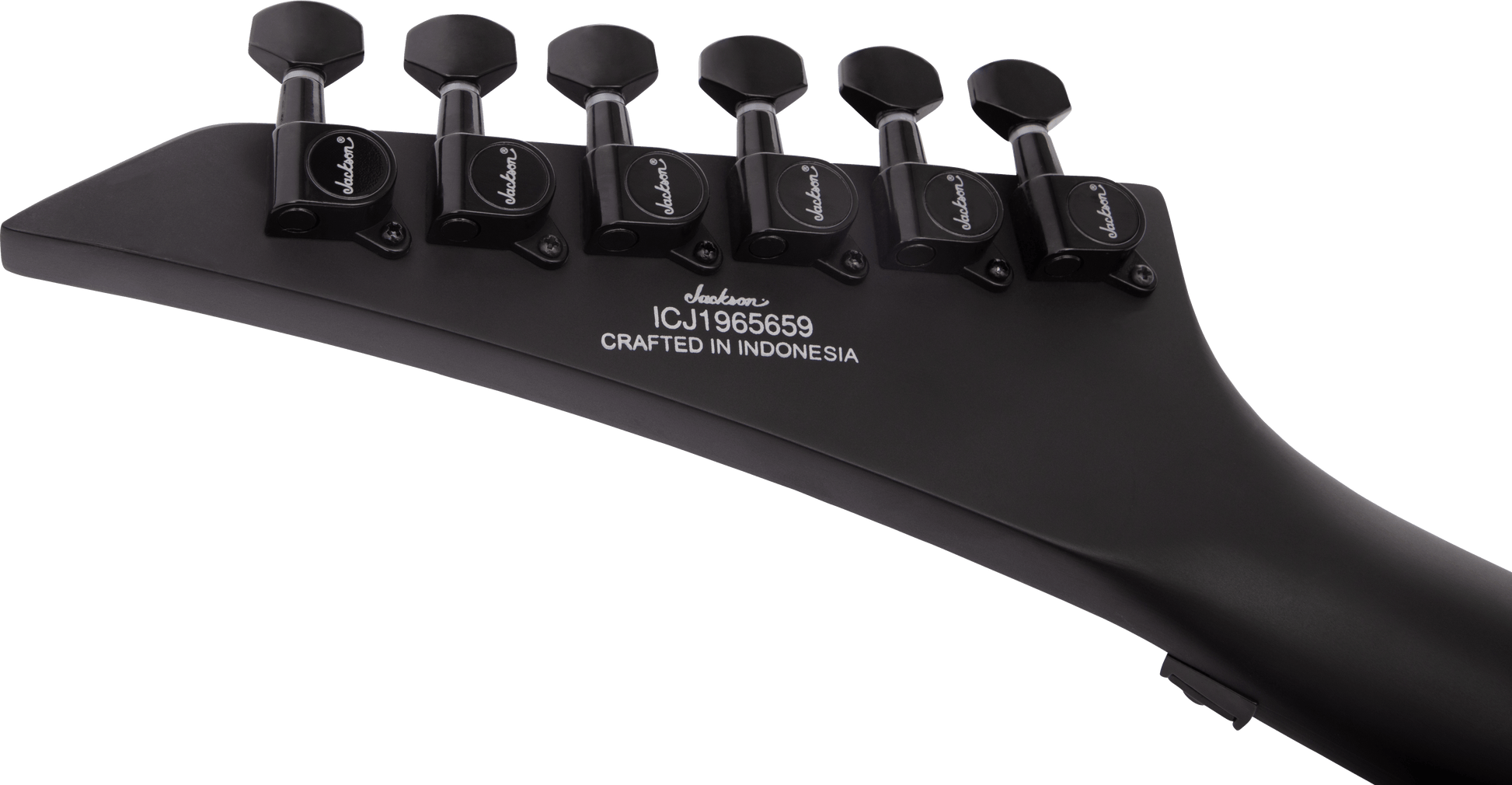 Cloaked in either Satin Black or Slime Green with Black Bevels, this royal axe is finished off with a Jackson pointed 6-in-line black headstock and black hardware.