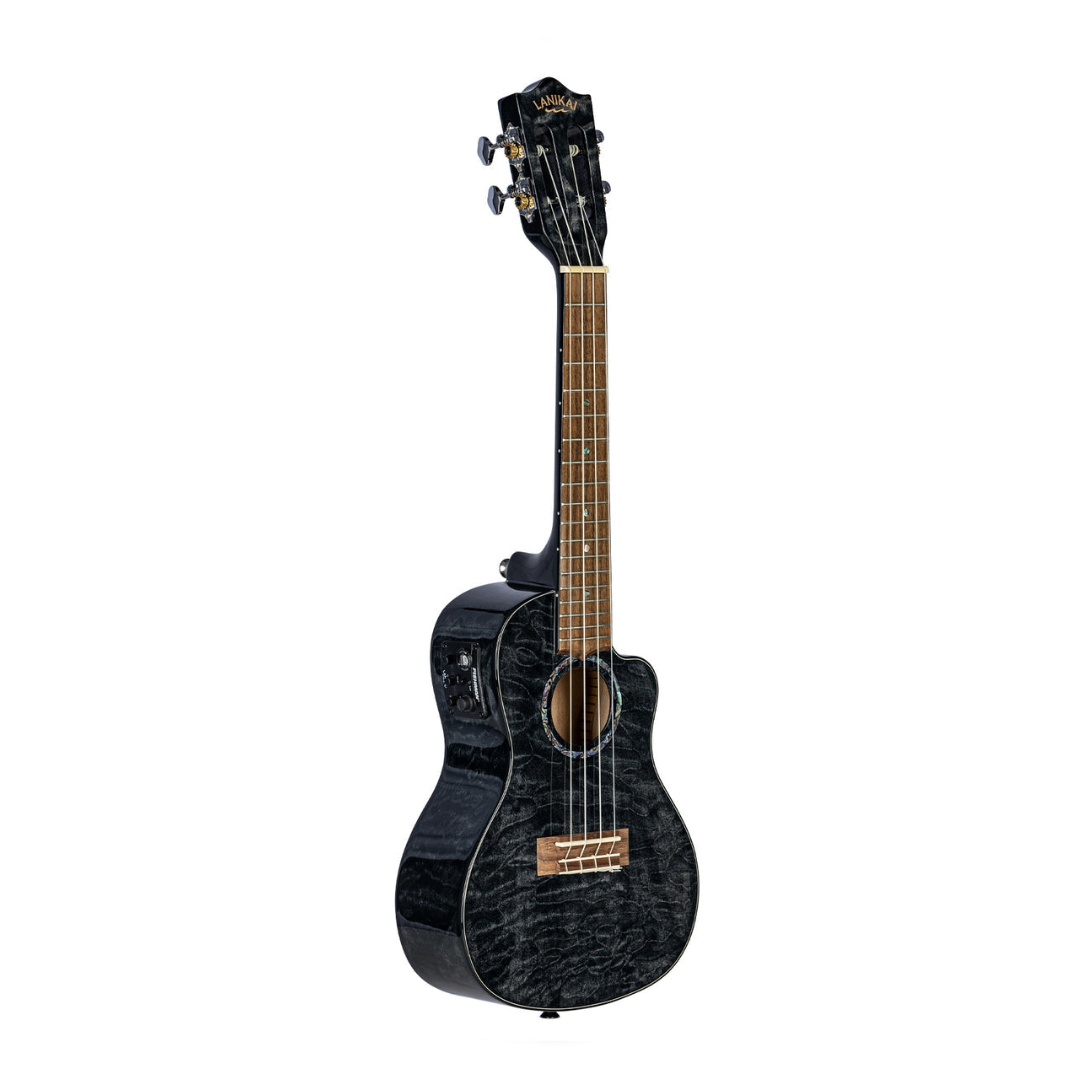 A Lanikai Quilted Maple cutaway electric concert ukulele in trans black provides a wider nut for player comfort, select figured wood, Grover® open back tuners on a slotted headstock, multi-ply black ABS body binding, NuBone XB® nut and saddle, D’Addario® strings, Fishman® Kula preamp and tuner, glossy finish, foam case and a Limited Lifetime Warranty. From an intimate acoustic stage to a concert stage a Lanikai quilted maple series is an excellent choice for performance. Built as a reliable go-to ukulele, a quilted maple Lanikai is favored by artists around the globe.