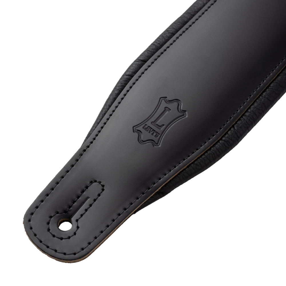 - Levy's 3" black top grain leather guitar strap with foam padding wrapped in black garment leather.