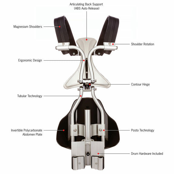Mapex offers Monoposto carriers by MAY. This aluminum snare drum carrier features a simple ergonomic lightweight design. This carrier is designed for comfort and fully adjustable to fit any player from small to large. Monoposto Snare Carrier w/ Contour Hinge and ABS (Articulating Back Support) System, Includes RM-MS Attachment for Quantum XT, Agility and other high tension snare drums