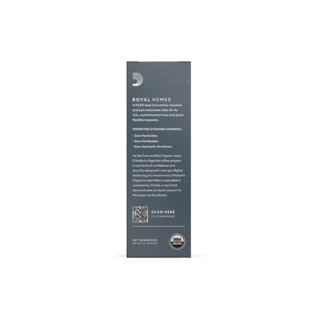Royal Hemke Organic reeds feature a shorter vamp and thinner tip with a filed cut, producing a dark, rich tone with immediate response and flexibility for both classical and jazz players.