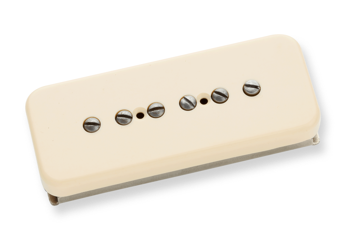 The neck model is full and round sounding, with single notes that have a sweet, musical, singing quality. It is also wound RW/RP to be hum-cancelling when engaged with a matching bridge pickup. When you remove our hand-aged soapbar covers, you’ll find the same hand-fabricated bobbin, plain enamel mag wire, and flatback tape that was made in Kalamazoo during the early days. This vintage P90 pickup is a drop-in replacement for any standard P90-sized rout, and is available in black or cream aged covers.