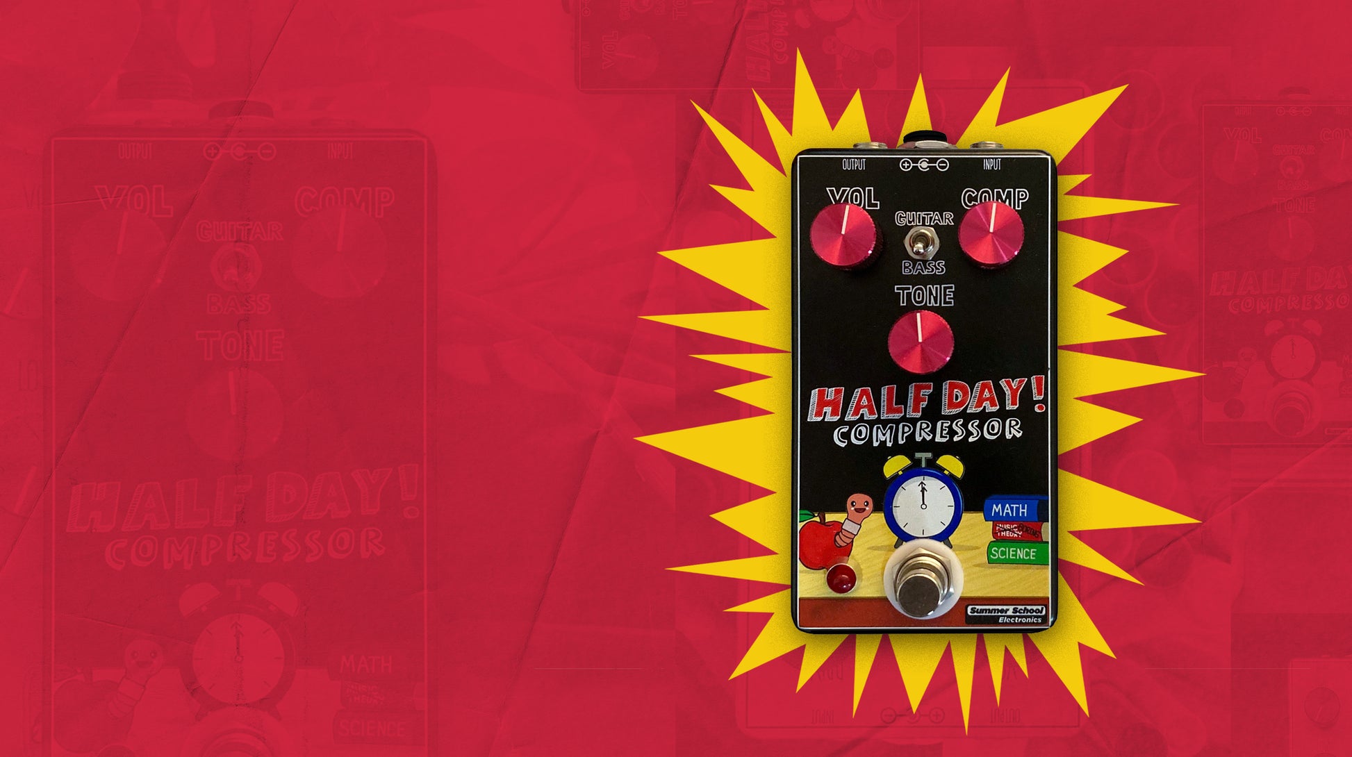 The Half Day Compressor from Summer School Electronics is a Ross-style compressor that boasts some modern amenities for today’s player. This compressor will level out your playing preventing any volume spikes while playing and raising any notes that are softer than the desired level for a smooth compressed sound. This is especially helpful when playing individual notes from string to string, or fingerpicking. The most notable upgrade is the toggle switch from Guitar to Bass which changes input capacitance. In “Guitar” mode, the lower frequencies are rolled off allowing the compressor to stand out in a band mix. In the “Bass” setting more lower frequencies are allowed to pass through making it ideal for bass, synths, baritone and drop tuned guitars. Other features include a tone control to further dial in the ideal sound based on music genre, and an included boost which allows the played to achieve the “squashed” compressor sound at higher volumes for solos. The Half Day runs on a standard 9-volt, neg. center power supply, and has a lifetime warranty. Hand built in Syracuse, NY by working musicians with attention to detail.